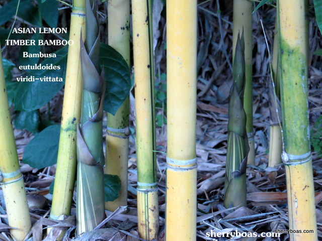 | The colorful green and yellow striped shoot of Asian Lemon Timber Bamboo are so pretty when they emerge |