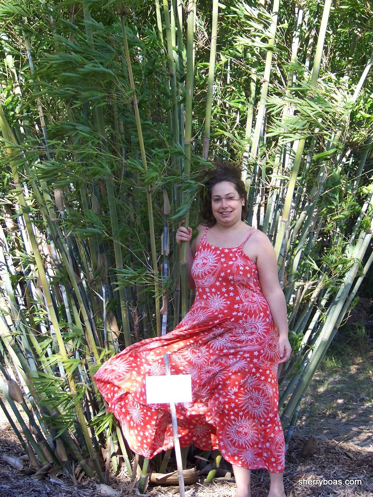 | Our daughter Jenny poses in front of a 3-year-old clump of Baby Blue. Note how dense the clump – which started with just one cane – has become in just 3 growing seasons! |