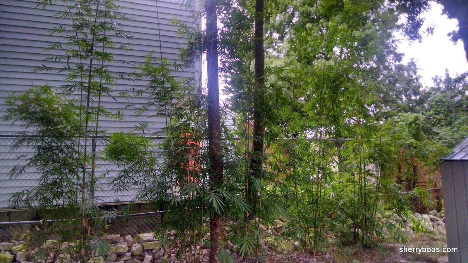 | The customers wanted to hide a neighbor’s unattractive chain link fence and orange door so they planted 5 three-gallon containers of Graceful Clumping Bamboo along the fence line |